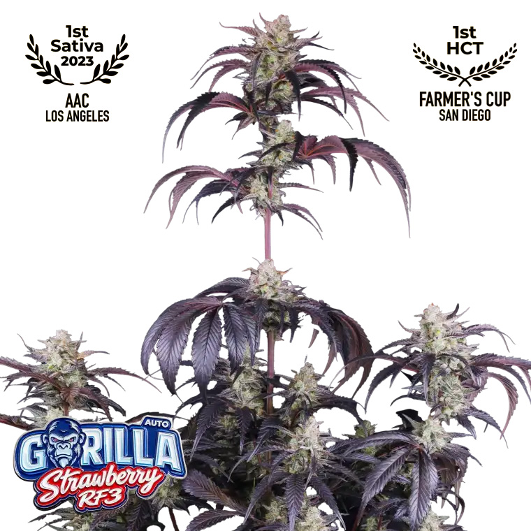 Strawberry Gorilla Auto RF3 by Fast Buds is an autoflowering cannabis seed made for high potency and heavy resin. It is part of the RF3 line, which aims for better stability and more consistent results. The plant starts flowering on its own, so you do not need to change the light schedule.